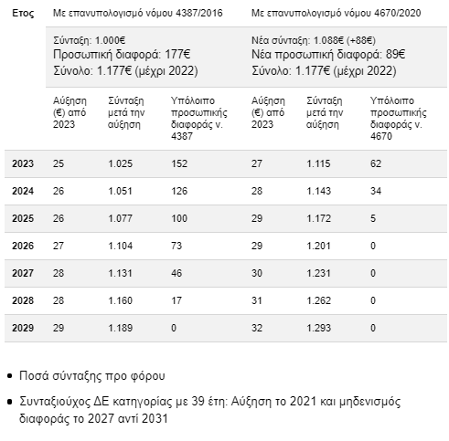 • Συνταξιούχος με 39 έτη και συντάξιμο μισθό 2.300 ευρώ θα έχει αύξηση κατά 144 ευρώ, από την οποία τα 93 ευρώ θα ισοφαρίσουν την προσωπική διαφορά και τα 46 ευρώ θα μπουν στην τσέπη με 19 ευρώ από φέτος και τα υπόλοιπα 25 ευρώ το 2022, 2023 και 2024.