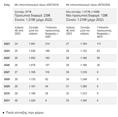 ​Με ποσοστό αυξήσεων 2,5% από το 2023 ο συνταξιούχος θα μηδενίσει την προσωπική διαφορά ως το 2027 και η σύνταξη θα ανεβεί στα 1.219 ευρώ ενώ θα αυξάνεται κάθε χρόνο. Αν έμενε ο νόμος Κατρούγκαλου θα περίμενε να δει αύξηση το 2031!