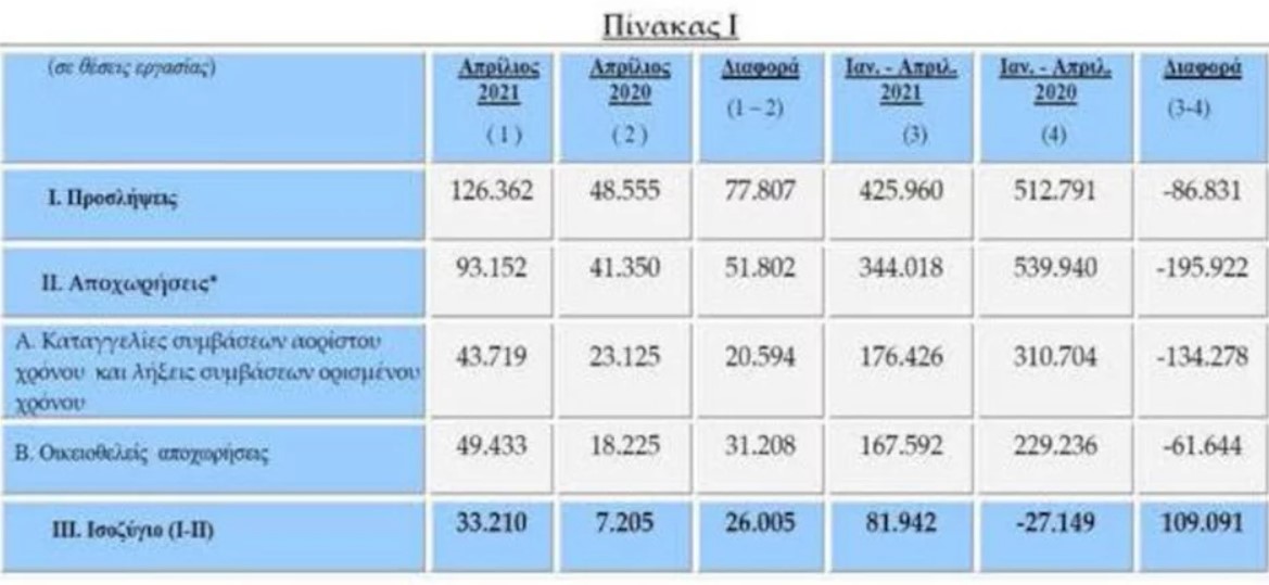 Στο τετράμηνο Ιανουαρίου – Απριλίου 2021 οι αναγγελίες προσλήψεων ανήλθαν στις 425.960 και οι αποχωρήσεις έφτασαν τις 344.018 (176.426 καταγγελίες συμβάσεων αορίστου χρόνου ή λήξεις συμβάσεων ορισμένου χρόνου και 167.592 οικειοθελείς αποχωρήσεις).