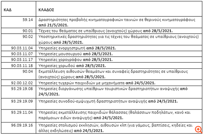 Β. Οι επιχειρήσεις – εργοδότες σε όλη τη χώρα, των οποίων η δραστηριότητα είχε ανασταλεί το μήνα Μάιο και περιλαμβάνεται στους ΚΑΔ του παρακάτω πίνακα, επαναλειτουργούν και πλήττονται από 21/4/2021 ή 24/5/2021 ή 28/5/2021.