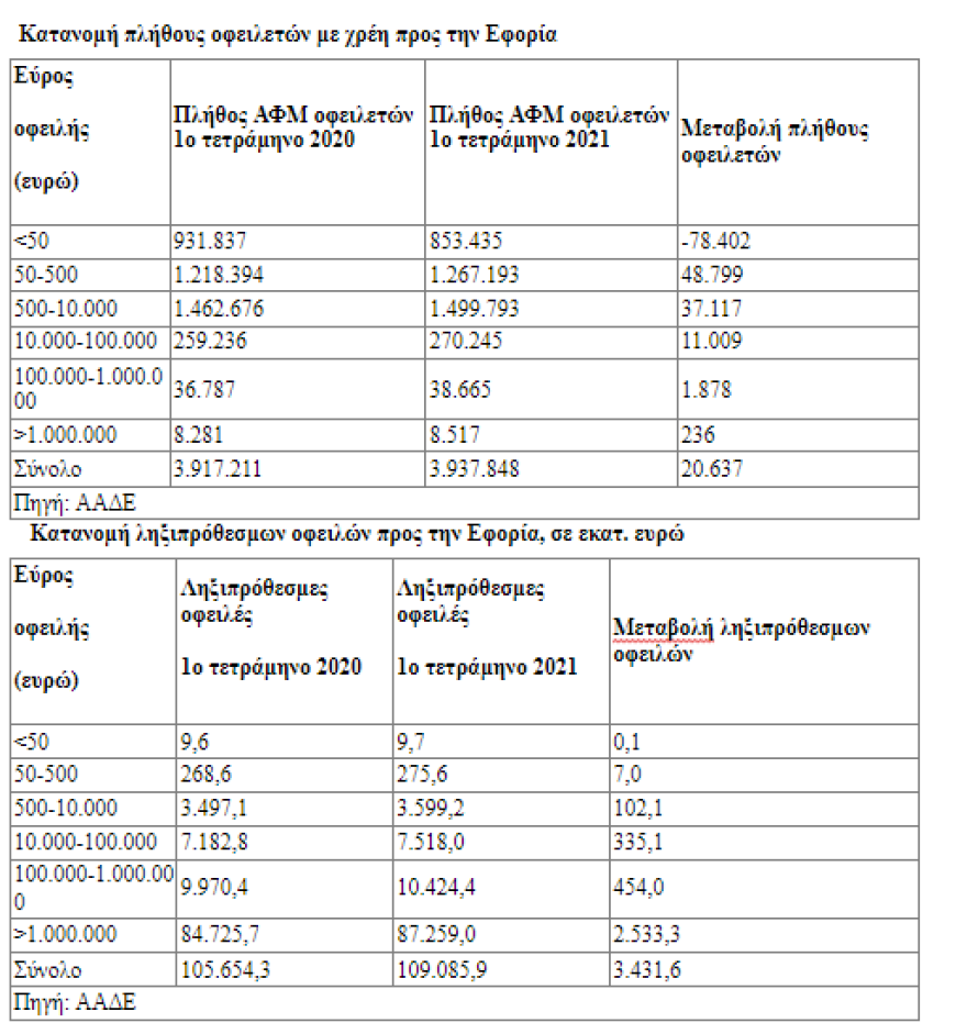 – Αναφορικά με τον συνολικό αριθμό των οφειλετών, στο τέλος 1ου τετραμηνου του τρέχοντος έτους παρατηρείται αύξηση κατά 20.637 φυσικά και νομικά πρόσωπα σε σχέση με την αντίστοιχη περίοδο του 2020 με αποτέλεσμα ο αριθμός αυτός να διαμορφώνεται στους 3.937.848 οφειλέτες.
