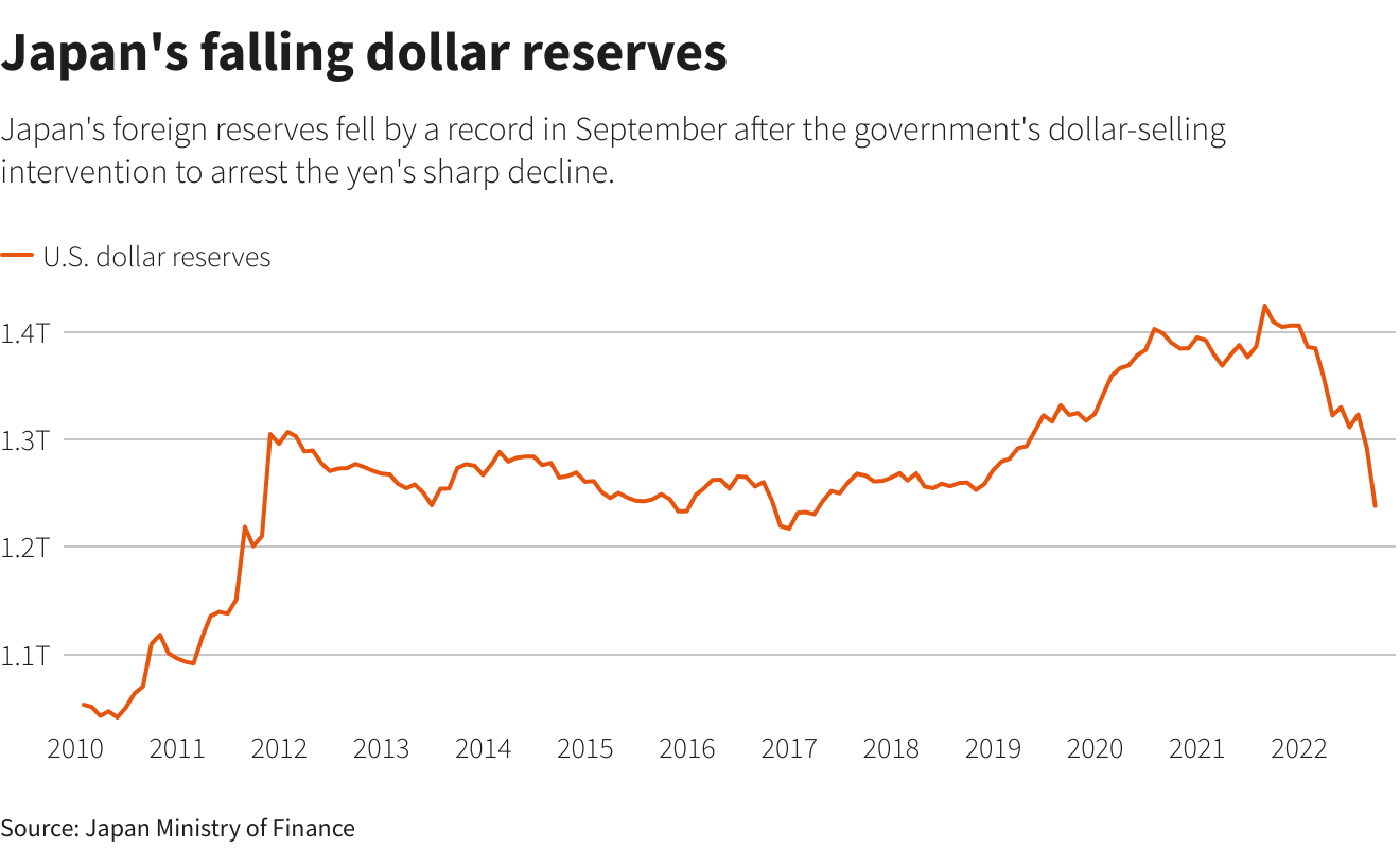 Στην Ιαπωνία τα αποθέματα ξένου συναλλάγματος ήταν 1,24 τρισ. δολάρια τον Σεπτέμβριο, έχοντας μειωθεί κατά 54 δισ. δολάρια σε σχέση με τον προηγούμενο μήνα, σύμφωνα με το υπουργείο Οικονομικών της χώρας.