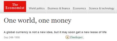 Μόλις δέκα χρόνια αργότερα, το 1998, ο Economist προβάλει και πάλι στο κοινό του μια προσπάθεια προώθησης της ατζέντας τωνglobalists με ένα άρθρο με τίτλο “One world, one money” / «Ένας κόσμος, ένα χρήμα».