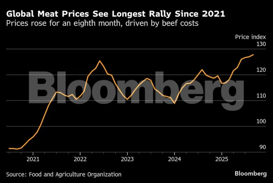 Οι διεθνείς τιμές κρέατος εκτινάχθηκαν σε νέο ιστορικό υψηλό τον Σεπτέμβριο, σημειώνοντας το μεγαλύτερο συνεχόμενο ανοδικό σερί από το 2021, καθώς η συρρίκνωση των κοπαδιών στις ΗΠΑ δεν επαρκεί για να καλύψει τη δυνατή ζήτηση για βοδινό.