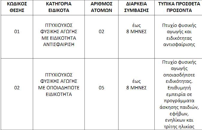 H πρόσληψη θα γίνει με σύμβαση εργασίας ιδιωτικού δικαίου ορισμένου χρόνου, συνολικής διάρκειας έως οκτώ (8) μηνών με ωριαία αποζημίωση, για την υλοποίηση των Προγραμμάτων «Άθλησης για Όλους» περιόδου 2021-2022.