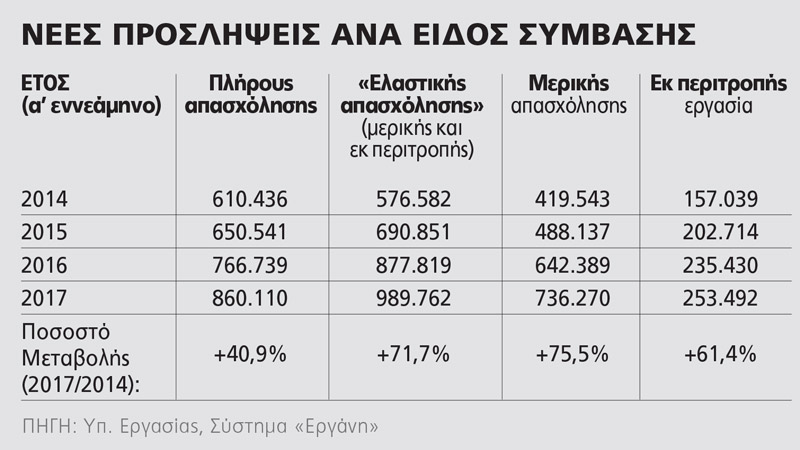 Διεθνώς, πάντως, το πρόβλημα δεν εστιάζεται στην ύπαρξη των ευέλικτων μορφών απασχόλησης. Στόχος τους δεν είναι να υποκαταστήσουν τη δημιουργία ποιοτικών νέων θέσεων εργασίας με πλήρη και καλά αμειβόμενη απασχόληση, αλλά έχουν συμπληρωματικό χαρακτήρα και συνυπάρχουν σε όλες τις ανεπτυγμένες χώρες. Το πρόβλημα στην Ελλάδα είναι η απόλυτη κυριαρχία τους τα τελευταία 2 χρόνια σε βάρος των θέσεων πλήρους απασχόλησης. Τα στοιχεία της «Εργάνης» αποτελούν αδιάψευστο μάρτυρα της ιστορικής ανατροπής που συντελέστηκε σε βάρος των εργαζομένων. Το 2016 ο ρυθμός νέων προσλήψεων ανέκτησε τη δυναμική που είχε προτού καταλάβει ο ΣΥΡΙΖΑ την εξουσία, αλλά το 2013 η πλήρης απασχόληση κυριαρχούσε με 63,73% (έναντι 36,27% των ευέλικτων μορφών απασχόλησης), ενώ τον Ιούλιο του 2017 οι ευέλικτες μορφές εκτινάχθηκαν στο 54,26%, σε βάρος της πλήρους απασχόλησης που κατέρρευσε στο 45,74%.