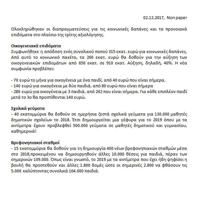Από το 2018, στο πλαίσιο της συμφωνίας, αλλάζουν τα πάντα στα επιδόματα τέκνων. Σε ότι αφορά στο ΦΠΑ στα νησιά, την παραμονή στο χαμηλό συντελεστή στα 32 νησιά δηλαδή και μετά την 1η Ιανουαρίου του 2018, δεν έχει επιτευχθεί ακόμη συμφωνία. Το θέμα παραμένει ανοιχτό, με τις αρμόδιες πηγές να τονίζουν ότι το ζήτημα θα κλείσει πριν το τέλος του μήνα. Τονίζουν ακόμη ότι για το συγκεκριμένο θέμα υπάρχει δημοσιονομικός χώρος για το 2018.