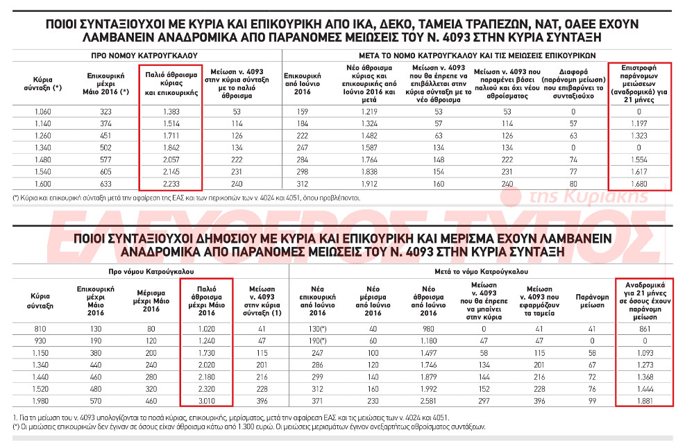 2. Από 861 ως και 1.880 ευρώ από την επιστροφή των παράνομων μειώσεων που διαπιστώνονται σε κύριες συντάξεις από τη λάθος εφαρμογή των περικοπών του νόμου 4093/2012 στο άθροισμα συντάξεων που είναι πάνω από 1.000 ευρώ για το Δημόσιο ή πάνω από 1.300 ευρώ για ΙΚΑ, ΟΑΕΕ, ΝΑΤ, ταμεία ΔΕΚΟ και τραπεζών.