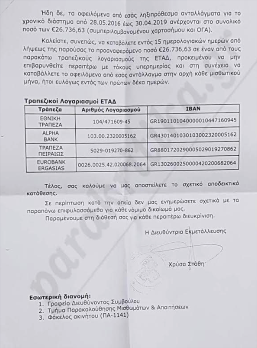 1«Τα μισθώματα εισπράττονται με την κατάθεση των σχετικών ποσών σε τραπεζικό λογαριασμό της ΕΤΑΔ Α.Ε.», σημειώνεται χαρακτηριστικά στην πρώτη σελίδα της επιστολής, ενώ στην επόμενη αναγράφονται οι τέσσερις λογαριασμοί της ΕΤΑΔ Α.Ε. σε ισάριθμες τράπεζες.