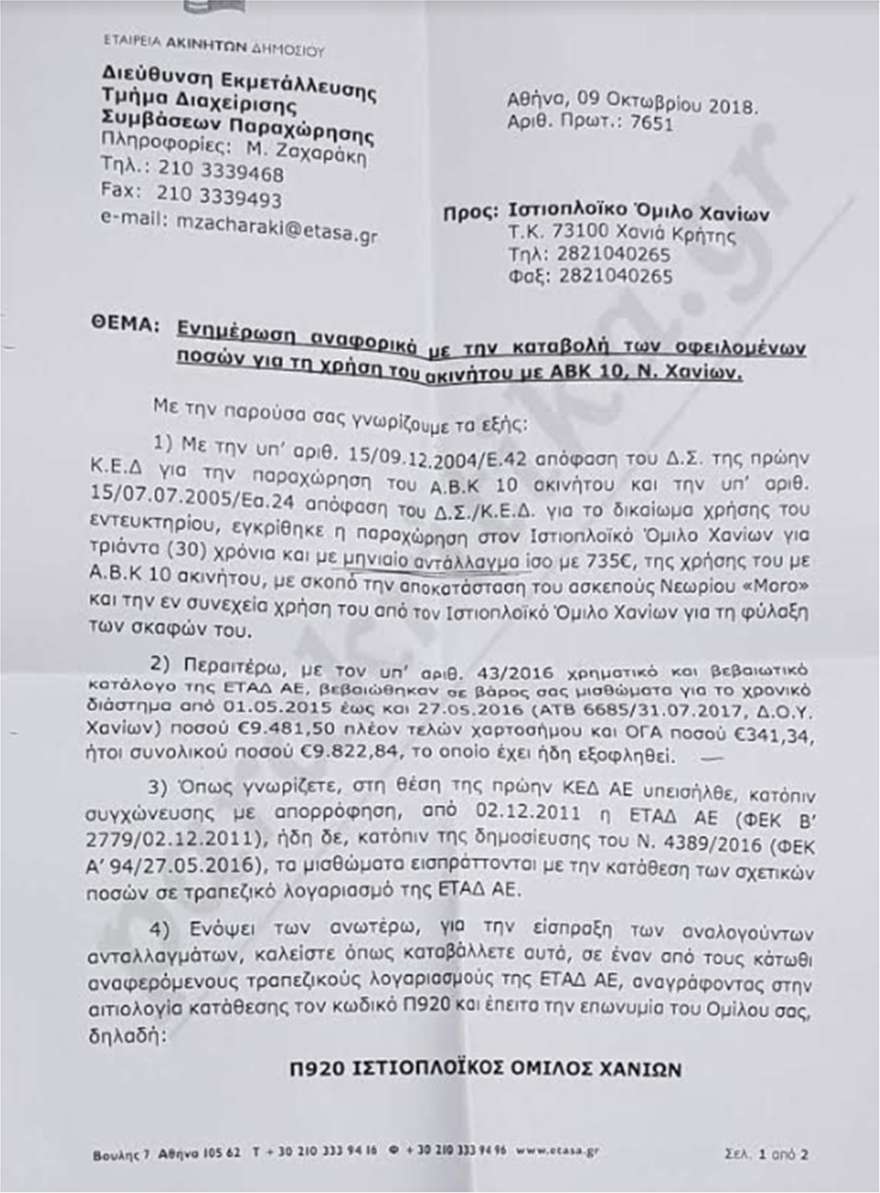 Στις 9 Οκτωβρίου η Εταιρεία Ακινήτων Δημοσίου (ΕΤΑΔ Α.Ε.), που είναι θυγατρική του Υπερταμείου, έστειλε επιστολή στον Ιστιοπλοϊκό Όμιλο Χανίων με την οποία ενημέρωνε τη διοίκησή του, ότι το ενοίκιο για τη χρήση του Νεωρίου Μόρο θα καταβάλλεται πλέον όχι στην εφορία, αλλά στους τραπεζικούς λογαριασμούς της εταιρείας!