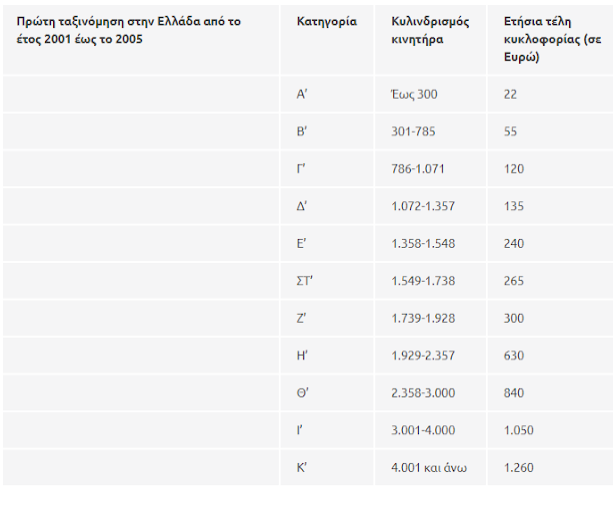 α) Επιβατικά αυτοκίνητα που έχουν ταξινομηθεί για πρώτη φορά στην Ελλάδα έως τις 31.10.2010 και δίκυκλες και τρίκυκλες μοτοσικλέτες ανεξαρτήτως της ημερομηνίας πρώτης ταξινόμησής τους στην Ελλάδα, με βάση τον κυλινδρισμό του κινητήρα αυτών, ως εξής: