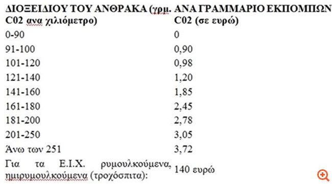 Λαμβάνονται υπόψη οι εκπομπές διοξειδίου του άνθρακα, όπως αυτές αναγράφονται στην άδεια του οχήματος, ως εξής:
