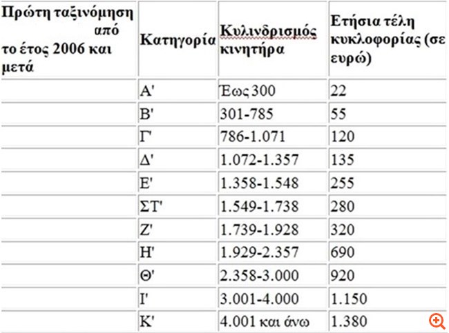Τα τέλη πρέπει να πληρωθούν έως το τέλος του έτους και εκπρόθεσμη πληρωμή συνεπάγεται πρόστιμο στο 100% των τελών που αναλογούν στο όχημα. Αναλυτικά τα τέλη κυκλοφορίας στους παρακάτω πίνακες.