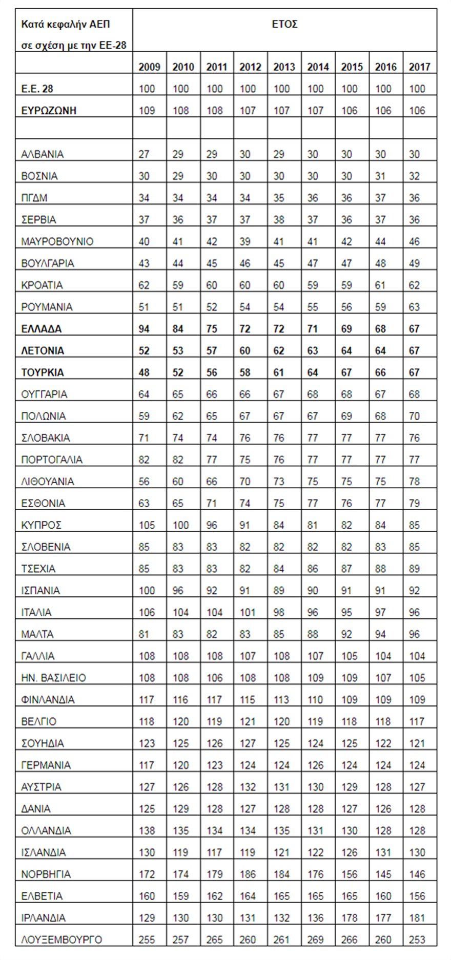 Με βάση τα στοιχεία της Eurostat, από το 2009 ως το 2017, το κατά κεφαλήν ΑΕΠ της Ελλάδας απομακρύνεται συνεχώς από τον μέσο όρο όλων των άλλων κρατών της Ευρώπης. Η Τουρκία και η Λετονία ήταν πολύ χαμηλότερα από την Ελλάδα όχι μόνον πριν ξεσπάσει η οικονομική κρίση, αλλά ακόμα και εκεί που φαινόταν να έχει πιάσει «πάτο» η Ελλάδα, δηλαδή το 2014. Μέσα σε 3 χρόνια μόλις όμως, η Τουρκία και η Λετονία (αλλά και η Πολωνία και οι περισσότερες άλλες χώρες που ήταν χαμηλότερα τότε) κατάφεραν να ανέβουν, ενώ η Ελλάδα έπαιρνε ξανά την κατηφόρα.