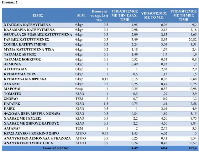 Εν συνεχεία με βάση τις τιμές αυτές, υπολογίζεται το συνολικό κόστος ενός τυπικού εορταστικού καλαθιού για τα Κούλουμα 2019. Αναλυτικά, οι ποσότητες και οι συνολικές αξίες κατ’ είδος παρουσιάζονται στον πίνακα 2. Συνοπτικά το μέσο κόστος του καλαθιού της Καθαράς Δευτέρας 2019 ανέρχεται σε 60,40 €, ενώ η αξία αυτή κυμαίνεται μεταξύ 31,49€ και 107,40 €. Σημειώνουμε ότι οι τιμές της λαγάνας αφορούν, προφανώς, εκτιμήσεις και όχι πραγματικές τιμές. Επίσης αναφέρουμε ότι στο καλάθι κατηγοριοποιήσαμε τα είδη για λόγους εύληπτης κατανόησης των αποτελεσμάτων.