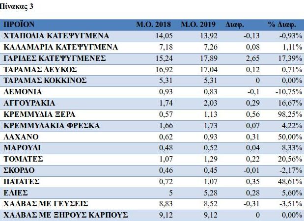 Η έρευνα διεξήχθη στα πλαίσια των τακτικών τιμοληψιών του Τμήματος Παρατηρητηρίου Τιμών την περίοδο από 25/2/2019 έως 6/3/2019 και επικεντρώθηκε σε συγκεκριμένα βασικά προϊόντα. Οι τιμοληψίες διενεργήθηκαν σε καταστήματα πώλησης τροφίμων (κεντρικές αγορές λιανικής, σούπερ μάρκετ και λαϊκές αγορές) της Περιφέρειας Αττικής. Οι αναγραφόμενες τιμές ανάγονται στις αντίστοιχες μονάδες μέτρησης.