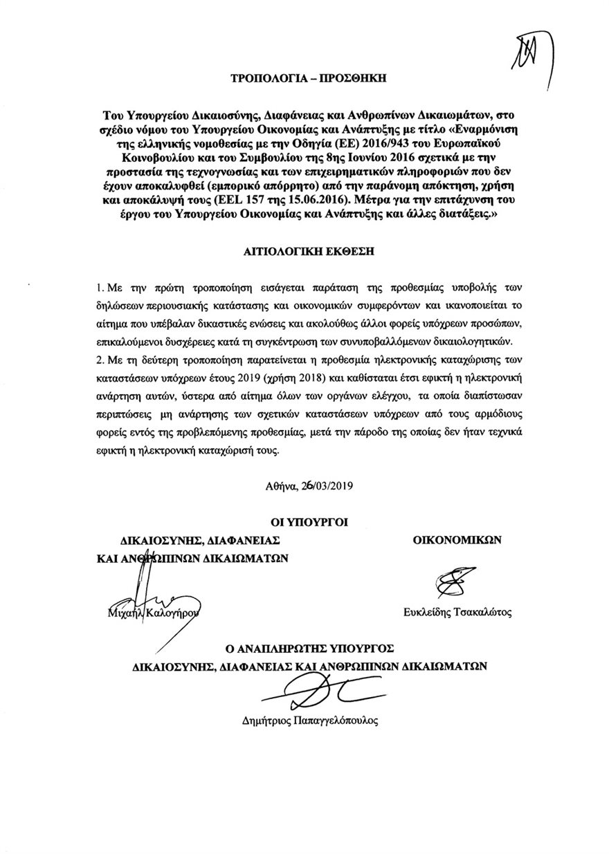 Παράταση εως το τελος Απριλίου 2019 για την υποβολή δηλώσεων περιουσιακης κατάστασης δίνει τροπολογια του υπουργείου Δικαιοσύνης που κατατέθηκε στην Βουλή.