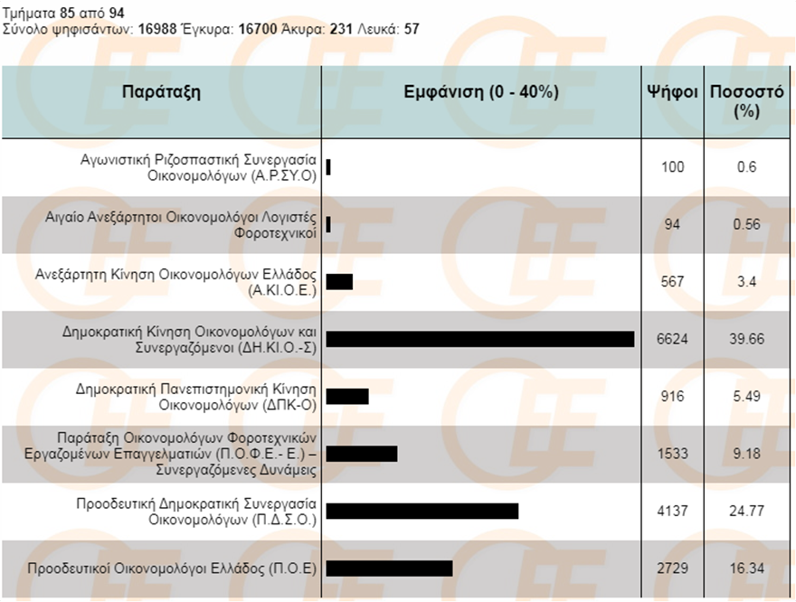 Πιο συγκεκριμένα, με καταμετρημένα τα 85 από τα 94 εκλογικά τμήμα, η ΔΗΚΙΟ βρίσκεται στην πρώτη θέση με ποσοστό 39,66%, έναντι 24,77% της δεύτερης Προοδευτικής Δημοκρατικής Συνεργασίας Οικονομολόγων (Π.Δ.Σ.Ο.).