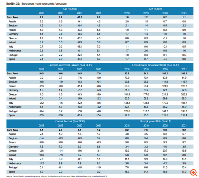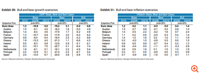 Αν και βλέπει ανάκαμψη από το γ’ τρίμηνο του 2020, η Morgan Stanley εκτιμά πως η επιστροφή του ελληνικού ΑΕΠ (όπως και άλλων οικονομιών της ευρωπεριφέρειας) στα προ πανδημίας επίπεδα, είναι δύσκολο να συμβεί πριν το 2022. Όπως εκτιμά, φέτος η ύφεση θα φτάσει το 13,3%, αν και σε περίπτωση επιδείνωσης της κατάστασης (και όπου η ύφεση στην ευρωζώνη από 10,8% θα κινηθεί στο 19,2%) μπορεί να αγγίξει ακόμα και το 21,3%.