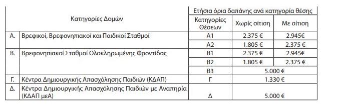1. Τα ετήσια όρια δαπάνης, που θα καταβάλλονται από την Ε.Ε.Τ.Α.Α., ανά κατηγορία Δομής (Α, Β, Γ, Δ) και ανά κατηγορία θέσης αυτών (Α1, Α2, Β1, Β2, Β3, Γ, Δ), που θα καλυφθούν και για το σύνολο των παρεχόμενων υπηρεσιών, διαμορφώνονται ως εξής:
