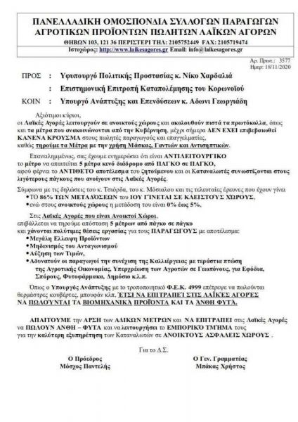 Ανοικτοί χώροι που κρατούνται οι αποστάσεις και τηρούνται όλα τα προβλεπόμενα μέτρα ασφαλείας (μάσκες, γάντια, αντισηπτικά) όμως η πώληση λουλουδιών και των ειδών ένδυσης απαγορεύεται, ενώ την ίδια στιγμή τα προϊόντα αυτά πωλούνται στα σούπερ μάρκετ που λειτουργούν σε κλειστούς χώρους και η μετάδοση του ιού σύμφωνα με τους λοιμωξιολόγους είναι 86%.