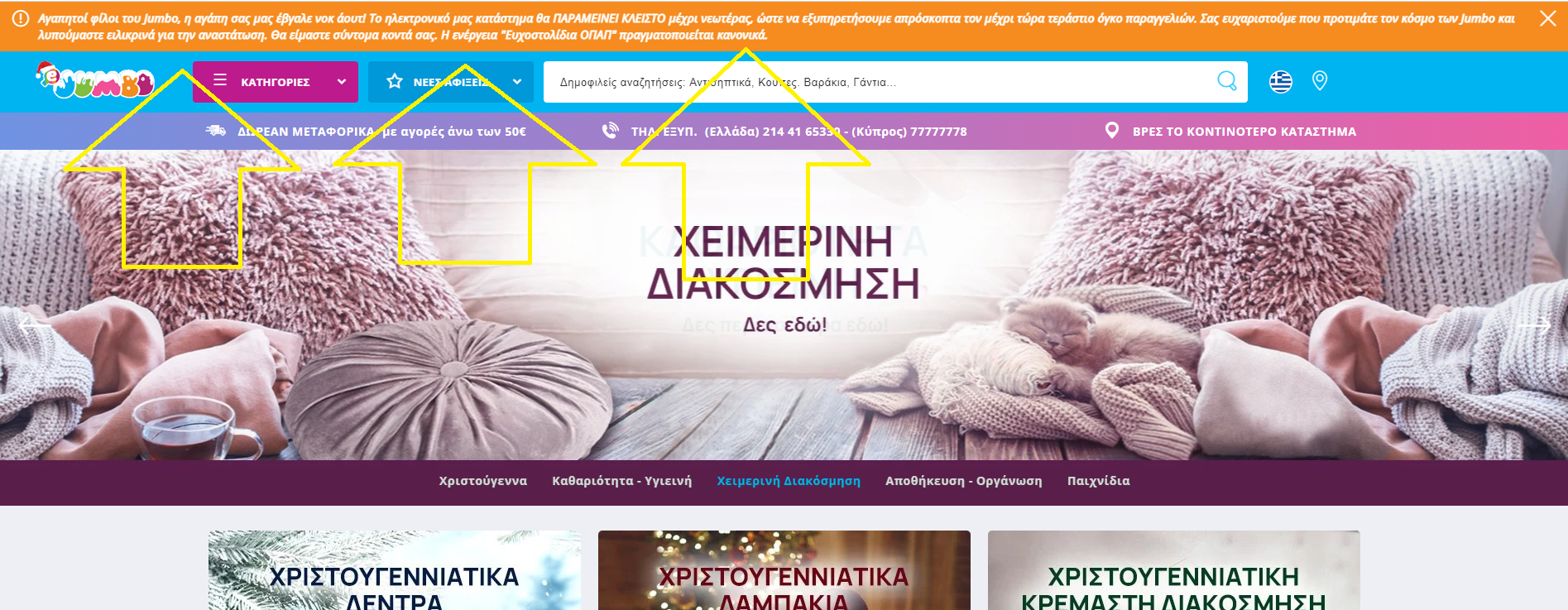 «Αγαπητοί φίλοι του Jumbo, η αγάπη σας μας έβγαλε νοκ άουτ! Το ηλεκτρονικό μας κατάστημα θα ΠΑΡΑΜΕΙΝΕΙ ΚΛΕΙΣΤΟ μέχρι νεωτέρας, ώστε να εξυπηρετήσουμε απρόσκοπτα τον μέχρι τώρα τεράστιο όγκο παραγγελιών. Σας ευχαριστούμε που προτιμάτε τον κόσμο των Jumbo και λυπούμαστε ειλικρινά για την αναστάτωση. Θα είμαστε σύντομα κοντά σας. Η ενέργεια “Ευχοστολίδια ΟΠΑΠ” πραγματοποιείται κανονικά».