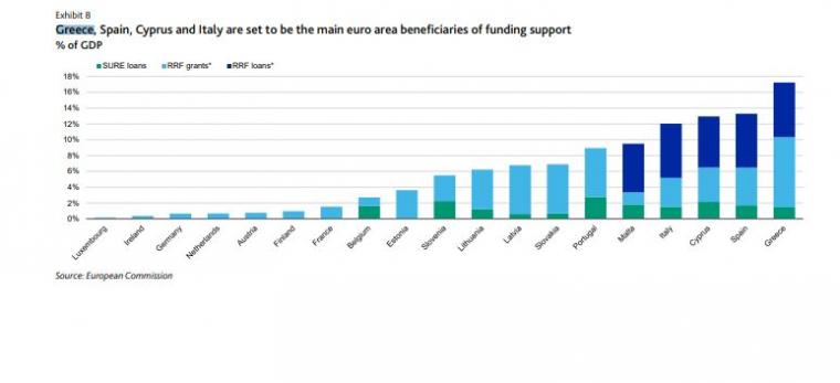 Έτσι παρά την προχρηματοδότηση 13% στο πλαίσιο του RRF – ο ακρογωνιαίος λίθος του NGEU – η Μοοdy’s αναμένει πως θα υπάρξουν σημαντικές οικονομικές επιπτώσεις από το β’ εξάμηνο του 2021.