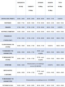 Σύμφωνα με την ανακοίνωση του ΟΚΑΑ, το κρεοπωλείο της αγοράς θα λειτουργήσει κανονικά την Κυριακή, ωστόσο, την Καθαρά Δευτέρα θα είναι κλειστό. Αντίθετα, τα υπόλοιπα καταστήματα θα παραμείνουν ανοιχτά από το πρωί της Κυριακής μέχρι αργά το βράδυ, με ορισμένα να συνεχίζουν τη λειτουργία τους όλη τη νύχτα έως και το μεσημέρι της Καθαράς Δευτέρας, ανάλογα με το πρόγραμμα κάθε επιχείρησης.