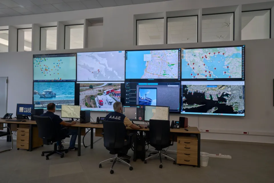 Στο αρχηγείο της ΑΑΔΕ στον Ταύρο, οι οθόνες απεικονίζουν τις τρέχουσες επιθεωρήσεις και τις εικόνες από την παρακολούθηση με drones από πολλαπλές τοποθεσίες: από εστιατόρια και λιμάνια έως κρυμμένα σιλό σιτηρών και φορτηγά διανομής φρούτων, ακόμη και ζωντανές ενδείξεις από τις δεξαμενές καυσίμων των πρατηρίων.