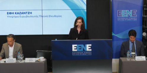 Η κα. Έφη Καζατζή στην τοποθέτησή της αναφέρθηκε στην ανάγκη να επιστρέψει η Ένωση στις δομικές της αξίες, όπως αυτή της προάσπισης των ανθρωπίνων δικαιωμάτων, της δημοκρατίας, της ανεξιθρησκείας, της παιδείας και της προσφοράς. Έπειτα, υπογράμμισε την ανάγκη οι πολιτικές της Ένωσης να θέτουν τον άνθρωπο στο επίκεντρό τους, στηρίζοντας ταυτόχρονα την επιχειρηματικότητα και την ανάπτυξη.