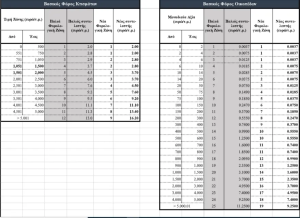Πρώτο βήμα: Ο υπολογισμός του φόρου ανά τετραγωνικό μέτρο. Οι χαμηλοτεροι συντελεστές του βασικού φόρου κτισμάτων διαμορφώνονται, ενδεικτικά, ως εξής: