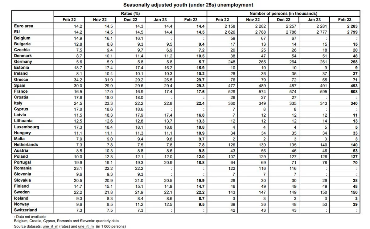 Στα ύψη βρίσκεται η ανεργία των νέων στην Ελλάδα, τον Φεβρουάριο, σύμφωνα με τα στοιχεία της Eurostat.