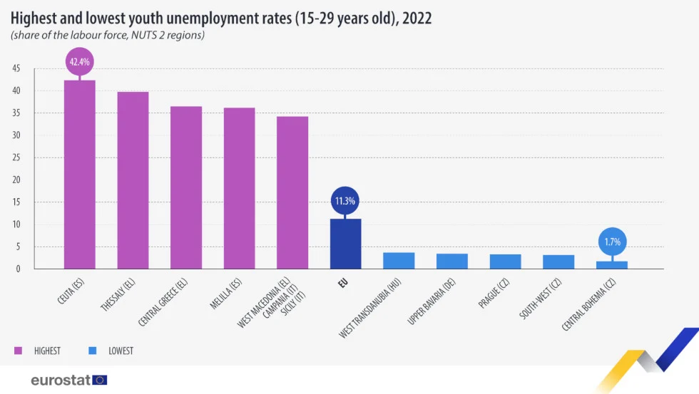Ειδικότερα η Θεσσαλία, η Κεντρική Ελλάδα και η Δυτική Μακεδονία είναι ανάμεσα στις επτά ευρωπαϊκές περιφέρειες με τη μεγαλύτερη ανεργία των νέων.