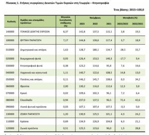Σύμφωνα με στοιχεία της ΕΛΣΤΑΤ, οι τιμές παραγωγού (γενικός δείκτης τιμών εκροών στη Γεωργία – Κτηνοτροφία) αυξήθηκαν τον Νοέμβριο 3,8% σε ετήσια βάση, ενώ σε σχέση με τον Οκτώβριο μειώθηκαν 0,4%.Τον Οκτώβριο είχαν αυξηθεί 1,9% σε ετήσια βάση και είχαν μειωθεί 2,7% σε μηνιαία βάση.