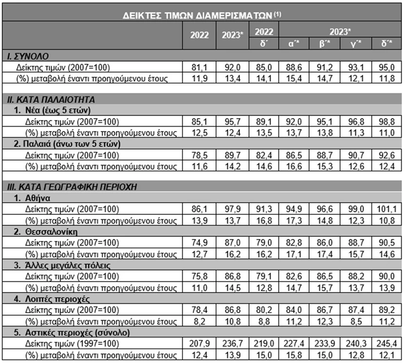 Τέλος, για το σύνολο των αστικών περιοχών της χώρας, το δ΄ τρίμηνο του 2023 οι τιμές των διαμερισμάτων ήταν κατά μέσο όρο αυξημένες κατά 12,1% σε σύγκριση με το δ΄ τρίμηνο του 2022, ενώ για το 2023 η μέση ετήσια αύξηση διαμορφώθηκε στο 13,9%.