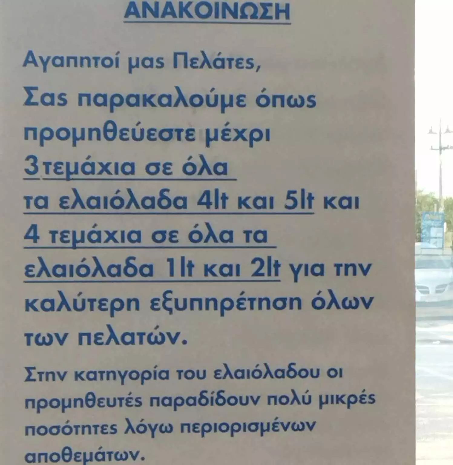 Η ανακοίνωση, που απευθύνεται κυρίως σε εμπόρους ζητάει από τους πελάτες να προμηθεύονται μέχρι 3 τεμάχια σε όλα τα ελαιόλαδα 4 και 5 λίτρων και μέχρι 4 τεμάχια όπως βλέπουμε σε όλα τα ελαιόλαδα ενός και 2 λίτρων για την καλύτερη εξυπηρέτηση όλων όπως αναφέρεται.