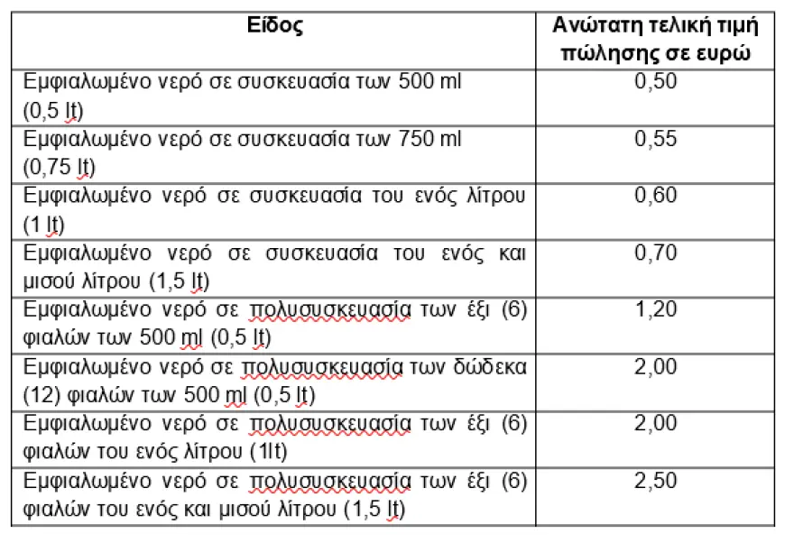 Συγκεκριμένα, για τις επιχειρήσεις κάθε είδους που διακινούν εμφιαλωμένο νερό καθορίζεται η εξής ανώτατη τελική τιμή: