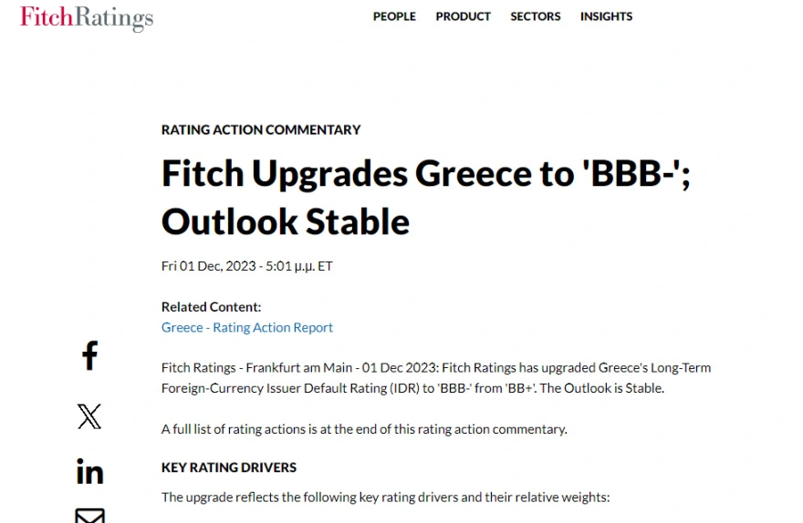 Είχε προηγηθεί η αναβάθμιση από την Standard & Poor’s στα τέλη Οκτωβρίου και αναμένεται σύντομα η αξιολόγηση και από τη Moody’s.