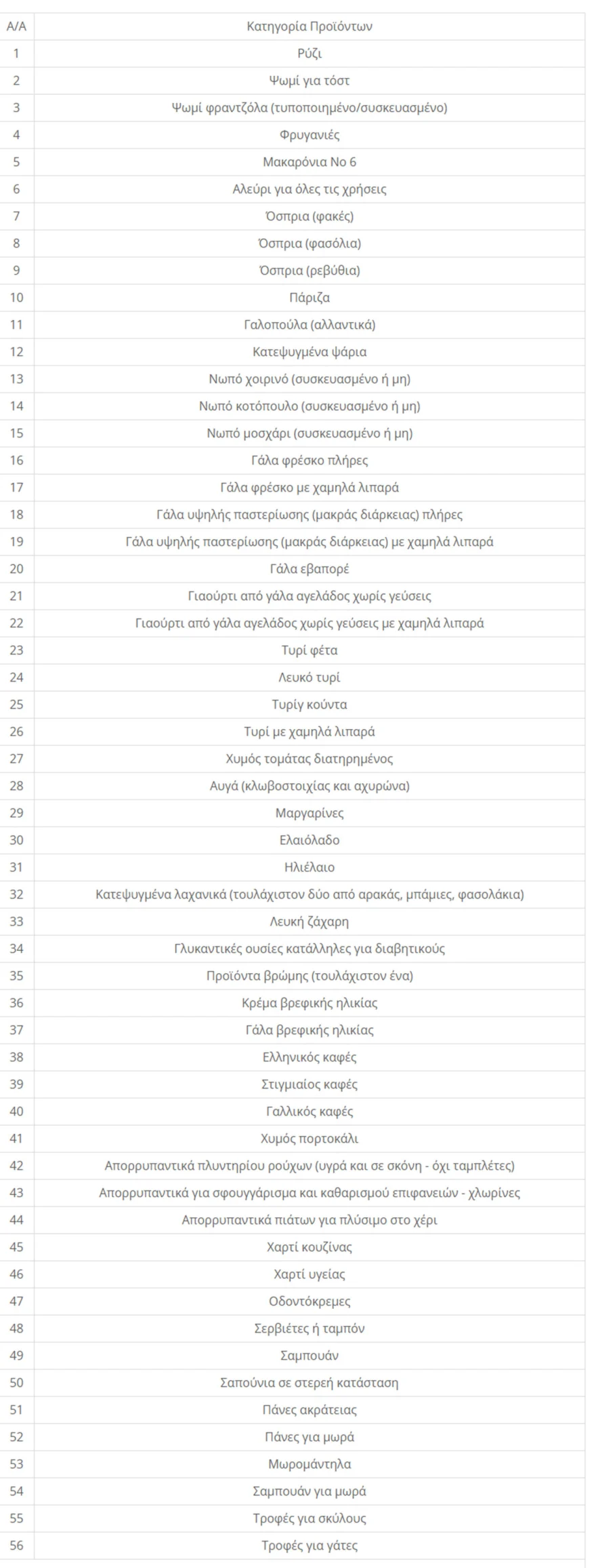 Στο Φύλλο της Εφημερίδας της Κυβερνήσεως δημοσιεύτηκε η υπουργική απόφαση η οποία επικαιροποιεί τη λίστα των κατηγοριών προϊόντων που περιλαμβάνονται στο «καλάθι του φτωχού».