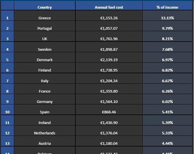Αυτό προκύπτει από την τελευταία έρευνα της Confused.com (3ο τρίμηνο 2022). Η έρευνα αποκαλύπτει τις ευρωπαϊκές χώρες στις οποίες οι οδηγοί ξοδεύουν το μεγαλύτερο ποσοστό του ετήσιου εισοδήματός τους για καύσιμα. Αυτό υπολογίστηκε αναλύοντας επίσημα στοιχεία για το μέσο ετήσιο εισόδημα κάθε χώρας σε σύγκριση με τη μέση κατανάλωση καυσίμων και τις τιμές καυσίμων ανά λίτρο.