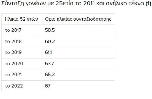 Γονείς ανήλικου τέκνου που συμπληρώνουν 25ετία το 2012 συνταξιοδοτούνται για πλήρη σύνταξη με το όριο ηλικίας που ισχύει όταν κλείσουν τα 55. Με ηλικία 55 το 2016, παίρνουν σύνταξη στα 58. Ενώ με ηλικία 55 από το 2017 βγαίνουν στα 59,6. Για παράδειγμα, ασφαλισμένος με ανήλικο και 25ετία το 2012 που συμπλήρωσε το 55ο έτος το 2018 μπορεί να συνταξιοδοτηθεί μέσα στο 2024 με το νέο όριο ηλικίας των 61 ετών.