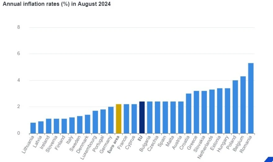 Ο ετήσιος ρυθμός πληθωρισμού στην ευρωζώνη ήταν 2,2% τον Αύγουστο του 2024, από 2,6 % τον Ιούλιο και 5,2% ένα χρόνο νωρίτερα, σύμφωνα με τα τελικά στοιχεία που ανακοίνωσε σήμερα η ευρωπαϊκή στατιστική υπηρεσία Eurostat.