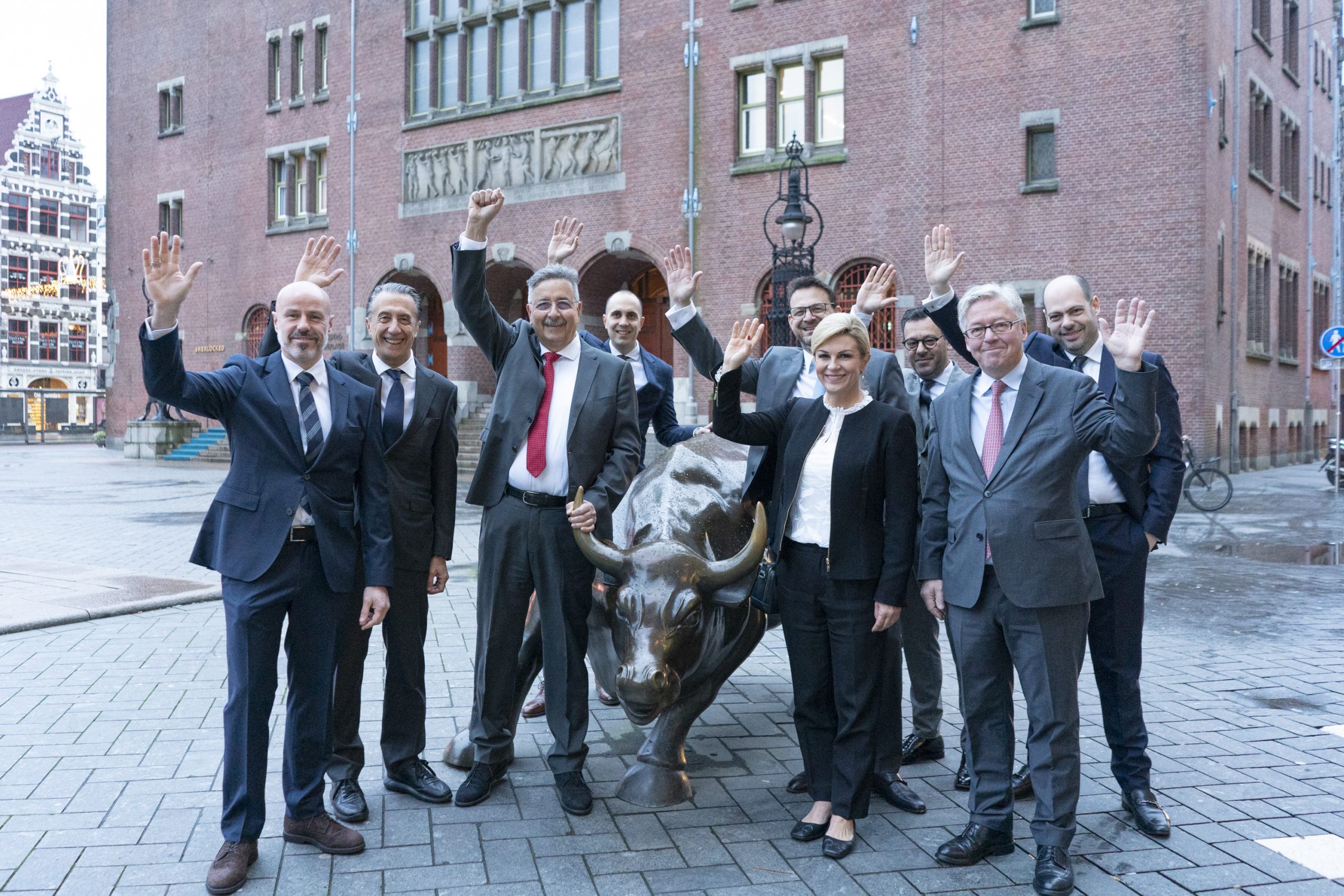 Ο Κρίστιαν Χατζημηνάς, Διευθύνων Σύμβουλος της THEON INTERNATIONAL, και η ομάδα του, χτύπησαν το Gong κατά τη διάρκεια της τελετής σήμερα το πρωί, παρουσία της Simone Huis in ‘t Veld (CEO, Euronext Amsterdam) και του René van Vlerken (Head of Listings Euronext Amsterdam), για να γιορτάσουν την εισαγωγή της εταιρίας στο Χρηματιστήριο του Άμστερνταμ