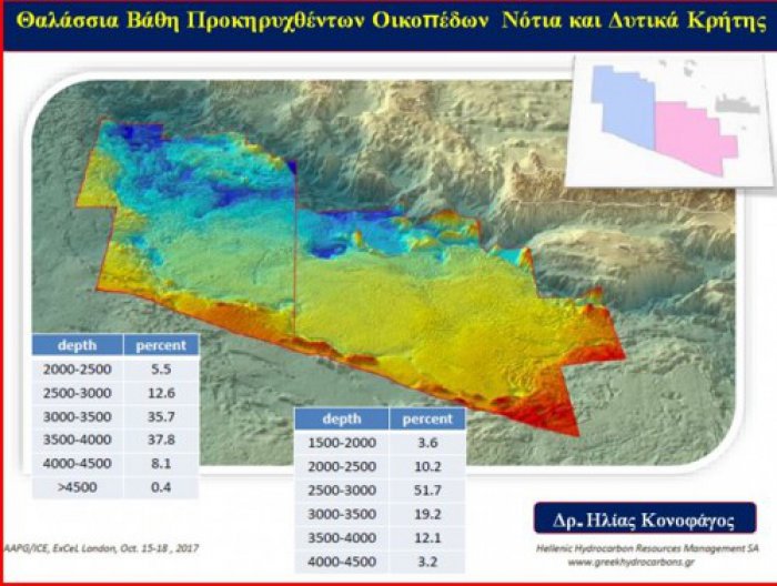 Να σημειώσουμε ότι στο οικόπεδο δυτικά της Κρήτης, το 36% του οικοπέδου βρίσκεται σε θαλάσσια βάθη 3.000 με 3.500 μέτρα. Στο οικόπεδο νοτιοδυτικά της Κρήτης, το 52% του οικοπέδου βρίσκεται σε θαλάσσια βάθη 2.500 με 3.000 μέτρα νερού.