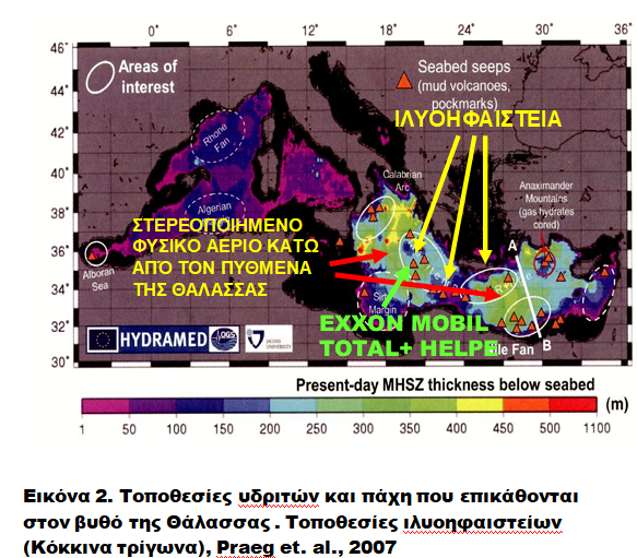 Ναι, υπάρχουν υδρίτες δυτικά της Πελοποννήσου στο Ιόνιο που προέρχονται από τα πεδία των ιλυοηφαιστείων Cephalonia, Pano di Sucharo, Cobblestone και Media. Και 10 χιλιόμετρα νοτιοδυτικά από τα ιλυοηφαίστεια υπάρχουν τα κοιτάσματα φυσικού αερίου στο μπλοκ που διεκδικούν οι εταιρείες EΧΧΟΝ-MΟΒΙΛ, TΟΤΑΛ και ΕΛΠΕ. Και πάλι βλέπουμε την σχέση ιλυοηφαίστεια, υδρίτες και κοιτάσματα φυσικού αερίου. Και αυτό συνεχίζεται μέχρι και νότια της Ρόδου – Καστελόριζου όπου υπάρχουν υδρίτες προερχόμενοι από τα 5 πεδία ιλυοηφαιστείων του της ύβωσης του Αναξίμανδρου. Οι περιοχές χαρτογραφήθηκαν επίσημα από τα ωκεανογραφικά ινστιτούτα της Τεργέστης και της Βαρκελώνης (εικόνες 2 και 3).