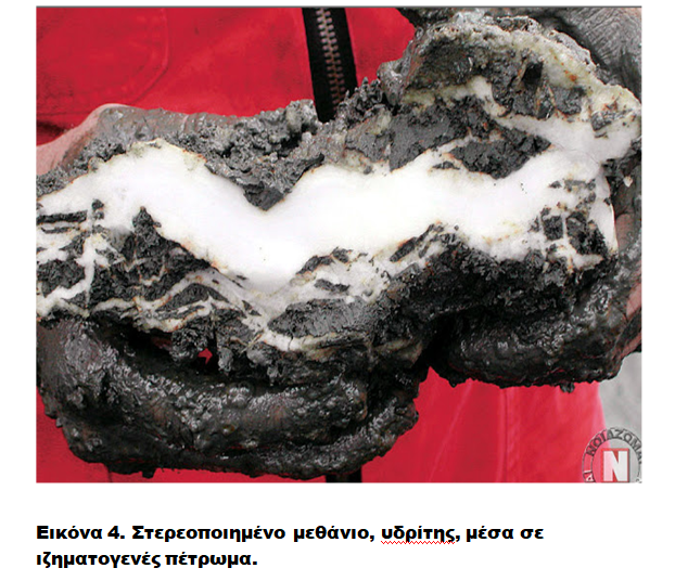 Οι υδρίτες ειναι το καύσιμο του μέλλοντος διότι αυτή την στιγμή δεν υπάρχει τεχνολογία αξιοποίησης τους ιδιαίτερα για τις ποσότητες που καθονται επανω στον βυθό της θάλασσας για αυτό αυτά τα αποθέματα τα λέμε μη συμβατικά. Τα πειράματα εκμετάλλευσης των υδριτών που έκαναν οι Κινέζοι στην Σινική θάλασσα αφορούσαν την παραγωγή μεθανίου από υδρίτες που βρίσκονται σε πόρους και ρωγμές σε βάθος περίπου 1000 μέτρων κάτω από τον πυθμένα της θάλασσας. Βεβαίως και εμείς έχουμε τέτοια αποθέματα υδριτών (εικόνα 2), που κάποια μέρα μπορεί να γίνουν αντικείμενο εκμετάλλευσης.