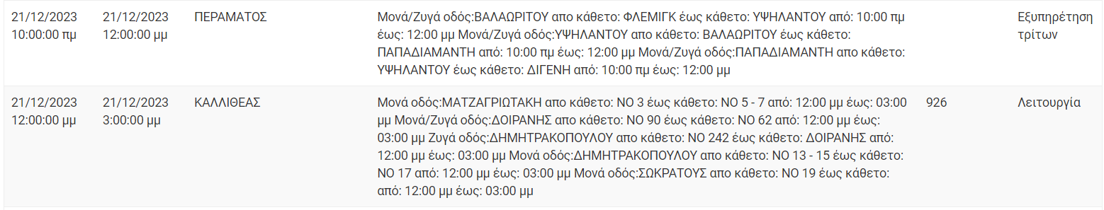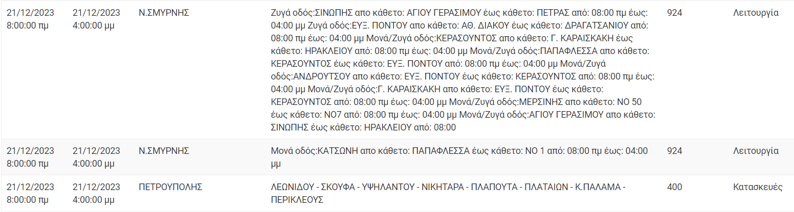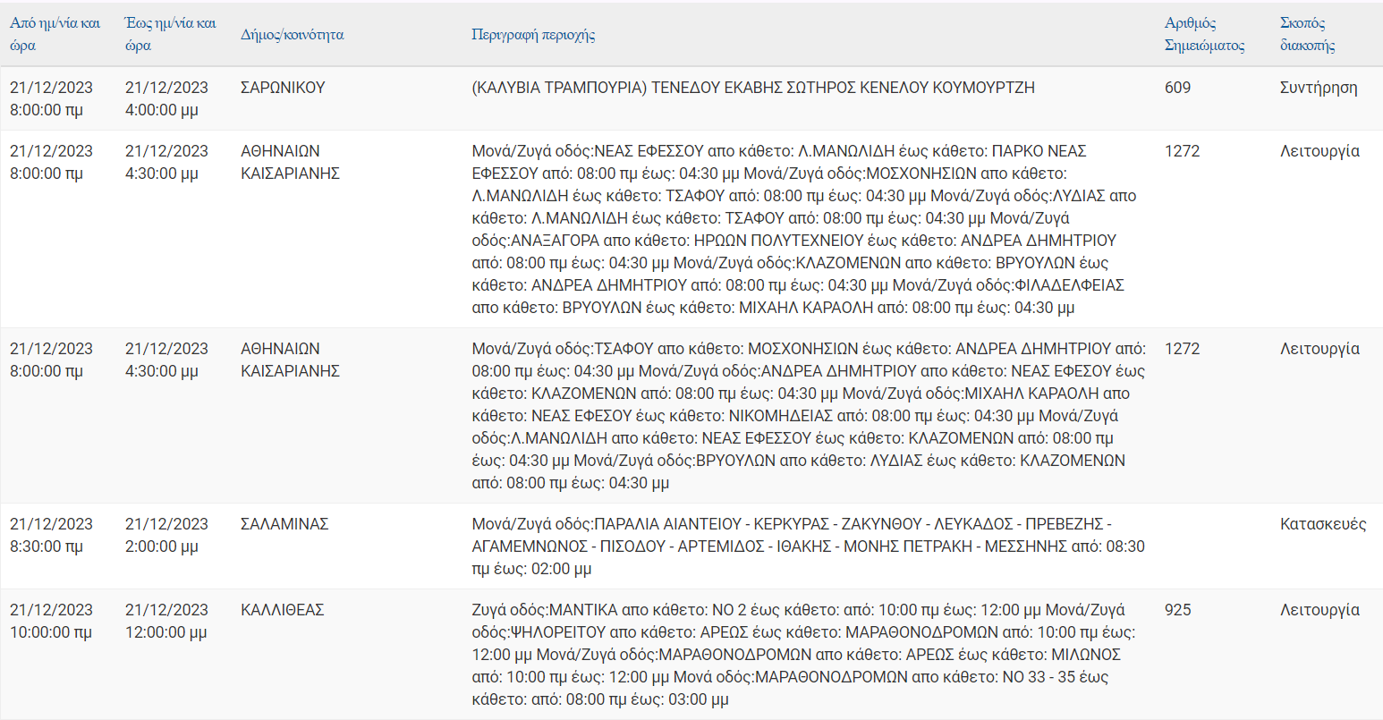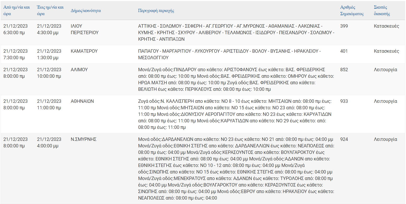 Ο ΔΕΔΔΗΕ, ανακοίνωσε πως για σήμερα Πέμπτη (21/12) έχει προγραμματίσει διακοπή ρεύματος σε αρκετές περιοχές της Αττικής.
