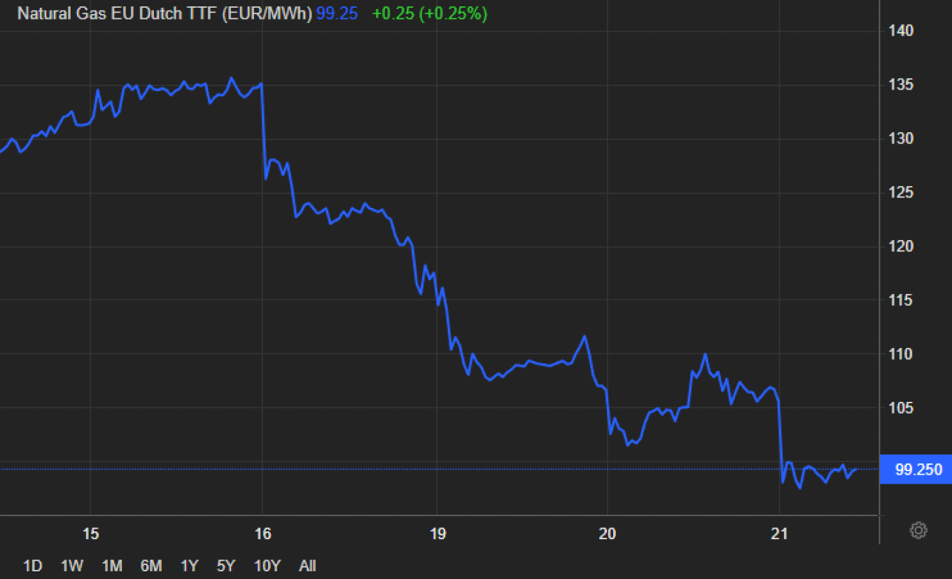 Καθοδική πορεία ακολουθούν, για τέταρτη ημέρα, οι τιμές του ευρωπαϊκού φυσικού αερίου, με αποτέλεσμα σήμερα το σημείο αναφοράς του TTF να υποχωρήσει ακόμα και κάτω από τα 100 ευρώ.