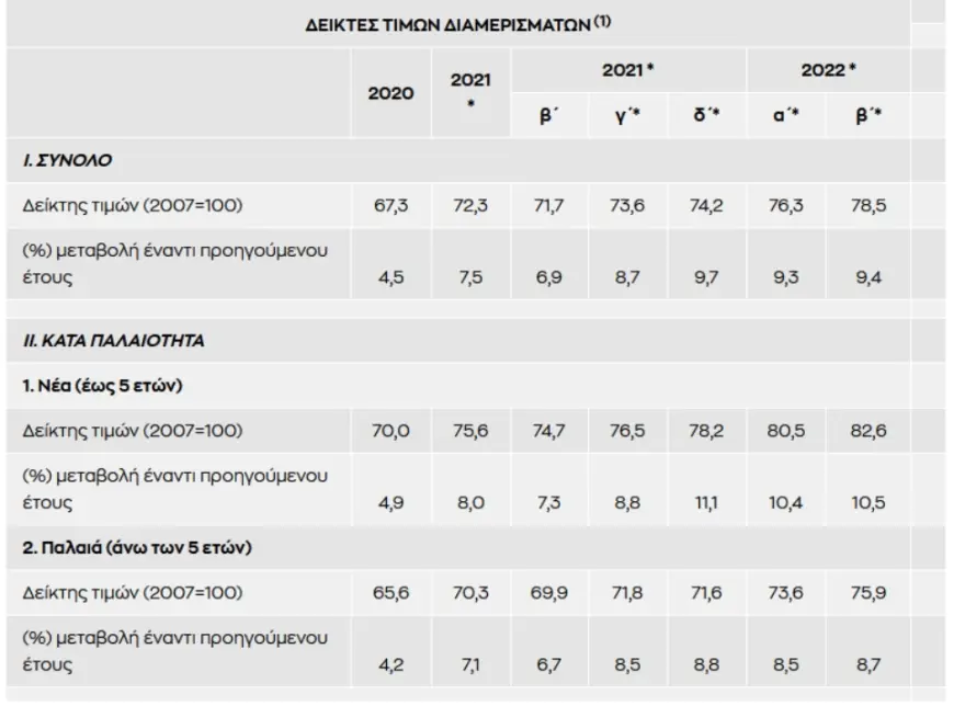 Με βάση τα αναθεωρημένα στοιχεία, το α’ τρίμηνο του 2022 σημειώθηκε αύξηση των τιμών των νέων διαμερισμάτων κατά 10,4%, ενώ οι τιμές των παλαιών διαμερισμάτων αυξήθηκαν κατά 8,5% σε σύγκριση με το αντίστοιχο τρίμηνο του 2021. Για το σύνολο του 2021, οι τιμές για τα νέα και τα παλαιά διαμερίσματα αυξήθηκαν με μέσο ετήσιο ρυθμό 8,0% και 7,1% αντίστοιχα.