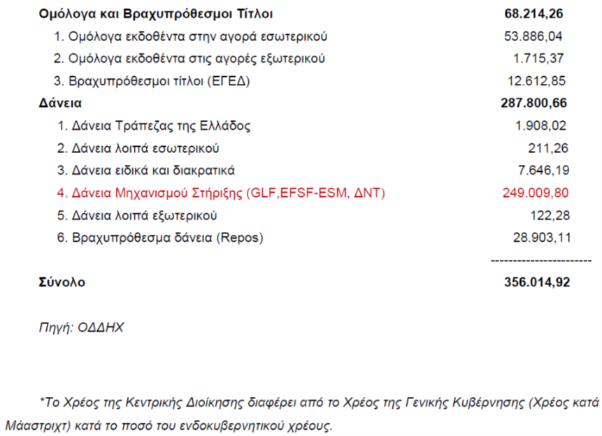 Τα δάνεια του «Μηχανισμού Στήριξης» που δόθηκαν στην Ελλάδα με τις τρεις Δανειακές Συμβάσεις-Μνημόνια αντιπροσωπεύουν περίπου το 70% του σημερινού δημόσιου χρέους. Για την εξυπηρέτηση (όχι αποπληρωμή) του χρέους τα τελευταία 10 χρόνια, από το 2010, πληρώθηκαν για χρεολύσια 265,6 δις. και για τόκους άλλα 83,8 δις. ευρώ. Σύνολο 349,4 δις. και χρωστάμε ακόμη περίπου άλλα τόσα ( 356 δις.). Τα χρήματα αυτά προήλθαν από συνεχή νέο δανεισμό (ανακύκλωση του χρέους) προκειμένου να διατηρηθεί η φερεγγυότητα της Ευρωζώνης – να συνεχίσει δηλαδή μια χώρα-μέλος να πληρώνει και να μη κάνει στάση πληρωμών. Τα τελευταία τρία χρόνια οι τόκοι πληρώνονται από το πρωτογενές αποτέλεσμα (όχι πλεόνασμα) του προϋπολογισμού και έτσι, από το λόγο αυτό, δεν αυξάνεται περαιτέρω το χρέος.